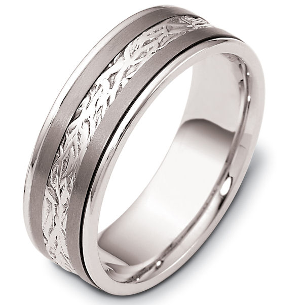 14 kt white gold and titanium , comfort fit, 7.0 mm wide wedding band. The ring has a beautiful pattern in the center. The two pieces on each side of the patterned gold are matte finish. The rest of the band is polished. Different finishes may be selected or specified.