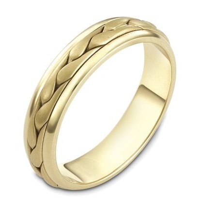 14 kt hand made comfort fit Wedding Band 5.0 mm wide. The ring has a handmade braid in the center with a brush finish. The edges are polished. Different finishes may be selected or specified.