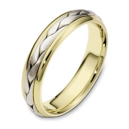 14 kt two-tone hand made comfort fit Wedding Band 5.0 mm wide. The ring has a handmade braid in the center with a brush finish. The edges are polished. Different finishes may be selected or specified.