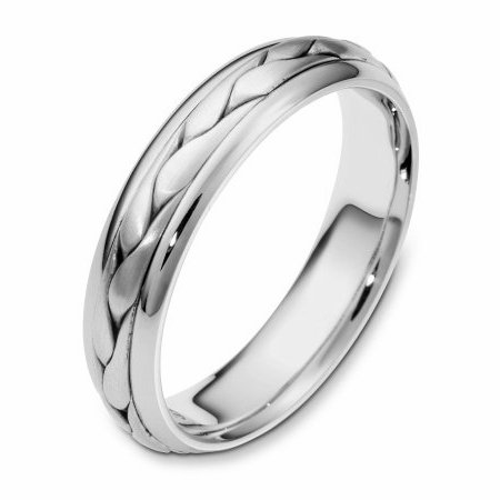 18 kt white gold, hand made comfort fit Wedding Band 5.0 mm wide. The ring has a handmade braid in the center with a brush finish. The edges are polished. Different finishes may be selected or specified.