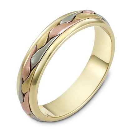 14 kt tri-color hand made comfort fit Wedding Band 5.0 mm wide. The ring has a handmade braid in the center with a brush finish. The edges are polished. Different finishes may be selected or specified.