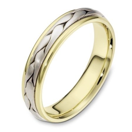 14 kt two-tone hand made comfort fit Wedding Band 5.0 mm wide. The ring has a handmade braid in the center with a brush finish. The edges are polished. Different finishes may be selected or specified.
