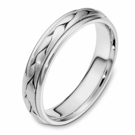 18 kt white gold, hand made comfort fit Wedding Band 5.0 mm wide. The ring has a handmade braid in the center with a brush finish. The edges are polished. Different finishes may be selected or specified.