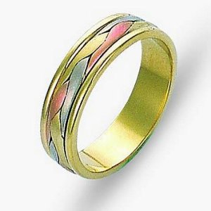 18 kt tri-color hand made comfort fit Wedding Band 5.0 mm wide. The ring has a handmade braid in the center with a brush finish. The edges are polished. Different finishes may be selected or specified.