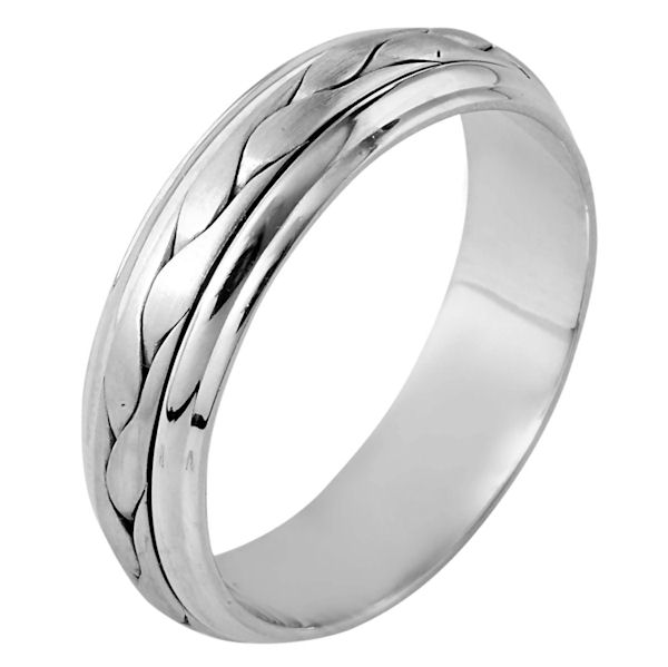 18kt white gold, hand made comfort fit Wedding Band 6.0 mm wide. The ring has a handmade braid in the center with a brush finish. The edges are polished. Different finishes may be selected or specified.