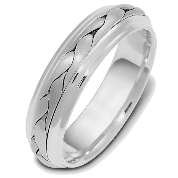 Platinum hand made comfort fit Wedding Band 6.0 mm wide. The ring has a handmade braid in the center with a brush finish. The edges are polished. Different finishes may be selected or specified.