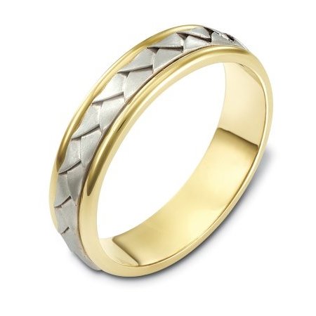 14 kt hand made comfort fit Wedding Band 5.0 mm wide. The ring has a handmade braid in the center with a brush finish. The edges are polished. Different finishes may be selected or specified.
