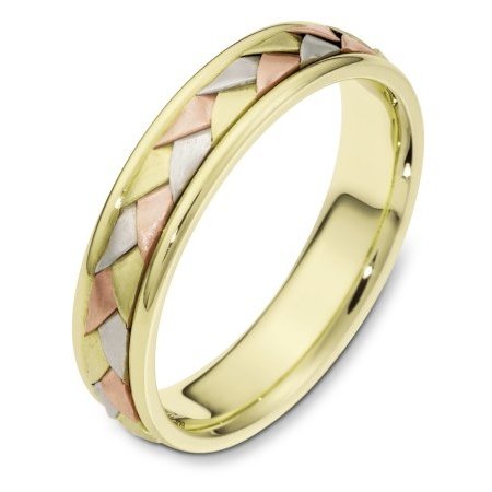 18 kt hand made tri-color comfort fit Wedding Band 5.0 mm wide. The ring has a handmade braid in the center with a brush finish. The edges are polished. Different finishes may be selected or specified.