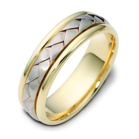18 kt hand made comfort fit Wedding Band 6.0 mm wide. The ring has a handmade braid in the center with a brush finish. The edges are polished. Different finishes may be selected or specified.