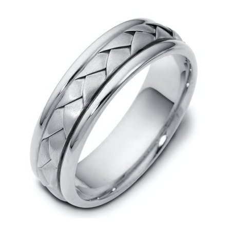 14 kt hand made comfort fit Wedding Band 6.0 mm wide. The ring has a handmade braid in the center with a brush finish. The edges are polished. Different finishes may be selected or specified.