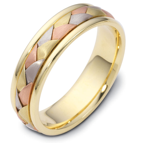 14 kt hand made comfort fit Wedding Band 6.0 mm wide. The ring has a handmade braid in the center with a brush finish. The edges are polished. Different finishes may be selected or specified.
