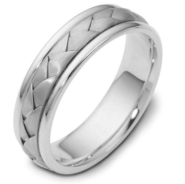 Platinum hand made comfort fit Wedding Band 6.0 mm wide. The ring has a handmade braid in the center with a brush finish. The edges are polished. Different finishes may be selected or specified.
