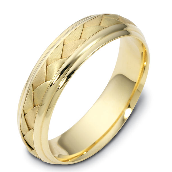 14 kt hand made comfort fit Wedding Band 5.5 mm wide. The ring has a handmade braid in the center with a brush finish. The edges are polished. Different finishes may be selected or specified.