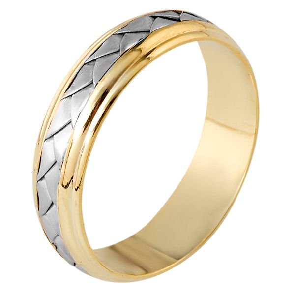 14 kt hand made comfort fit Wedding Band 5.5 mm wide. The ring has a handmade braid in the center with a brush finish. The edges are polished. Different finishes may be selected or specified.