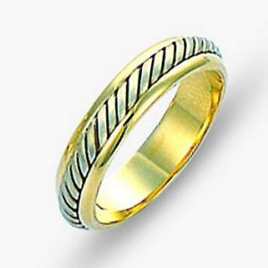 18 kt two-tone hand made comfort fit Wedding Band 4.5 mm wide. The ring has a hand made rope in the center with a brush finish. The edges are polished. Different finishes may be selected or specified.