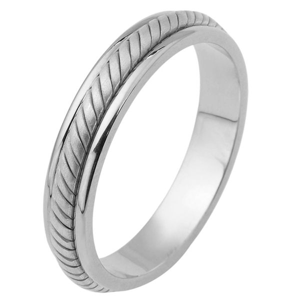 Platinum hand made comfort fit Wedding Band 5.0 mm wide. The ring has a hand made rope in the center with a brush finish. The edges are polished. Different finishes may be selected or specified.