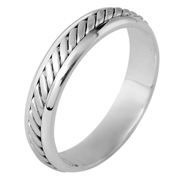 14 kt white gold, hand made comfort fit Wedding Band 4.5 mm wide. The ring has a hand made pattern in the center with a brush finish. The edges are polished. Different finishes may be selected or specified.