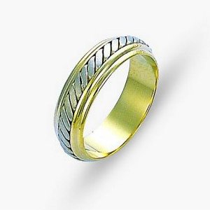 14 kt two-tone hand made comfort fit Wedding Band 5.5 mm wide. The ring has a hand made pattern in the center with a brush finish. The edges are polished. Different finishes may be selected or specified.