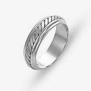 Platinum hand made comfort fit Wedding Band 5.5 mm wide. The ring has a hand made pattern in the center with a brush finish. The edges are polished. Different finishes may be selected or specified.