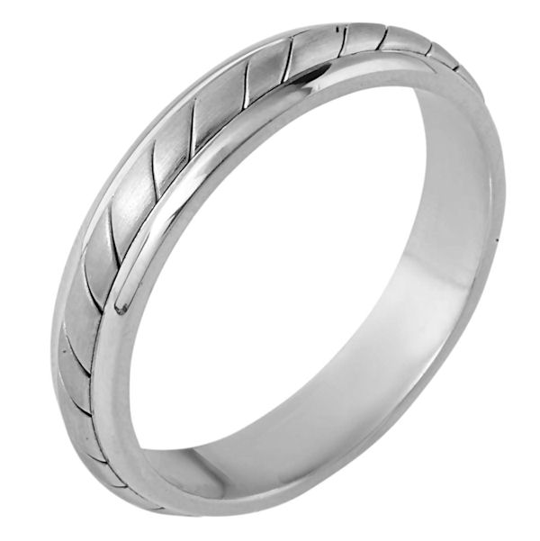 18 kt white gold, hand made comfort fit Wedding Band 4.5 mm wide. The ring has a hand made pattern in the center with a matte finish. The edges are polished. Different finishes may be selected or specified.