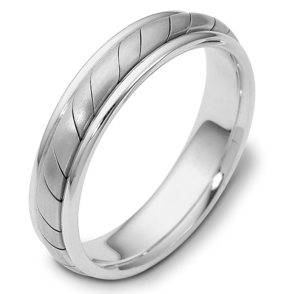 18 kt white gold, hand made comfort fit Wedding Band 5.0 mm wide. The ring has a hand made pattern in the center with a matte finish. The edges are polished. Different finishes may be selected or specified.