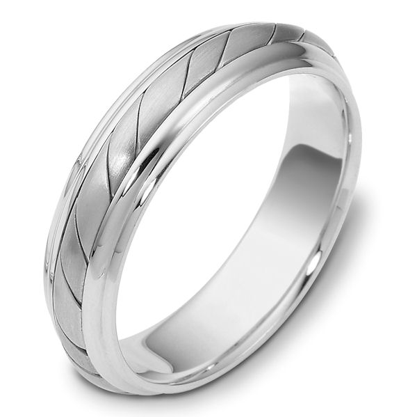 Platinum hand made comfort fit Wedding Band 5.0 mm wide. The ring has a hand made pattern in the center with a matte finish. The edges are polished. Different finishes may be selected or specified.
