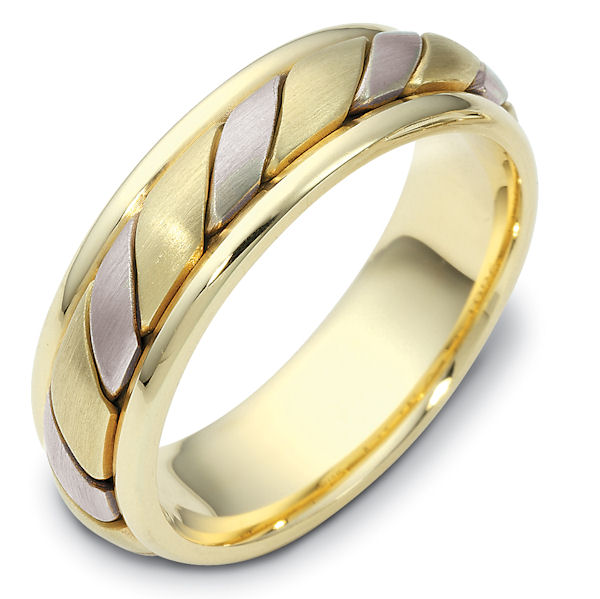 18 kt two-tone hand made comfort fit Wedding Band 5.5 mm wide. The ring has a hand made pattern in the center with a brush finish. The edges are polished. Different finishes may be selected or specified.