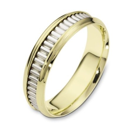 18 kt two-tone hand made comfort fit Wedding Band 6.0 mm wide. The ring has a hand made pattern in the center. The ring has a polished finish. Different finishes may be selected.