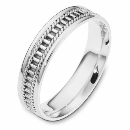 Platinum hand made comfort fit Wedding Band 5.0 mm wide. The ring has a hand made pattern in the center with one hand made rope on each side of the pattern. The whole ring is polished. Different finishes may be selected or specified.