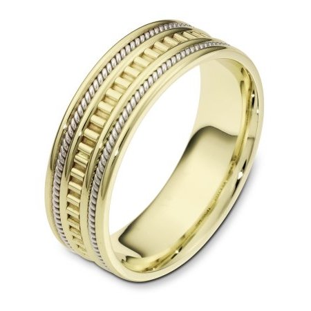 18 kt two-tone hand made comfort fit Wedding Band 7.0 mm wide. The ring has a hand made pattern in the center and two hand made ropes inlayed in the band. The whole ring is polished. Different finishes may be selected or specified.