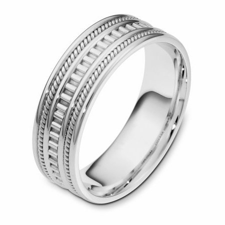 18 kt white gold, hand made comfort fit Wedding Band 7.0 mm wide. The ring has a hand made pattern in the center and two hand made ropes inlayed in the band. The whole ring is polished. Different finishes may be selected or specified.