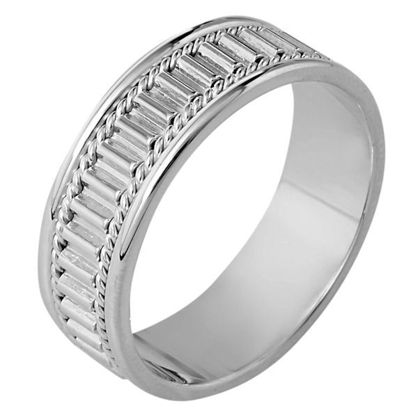 Platinum hand made comfort fit Wedding Band 7.0 mm wide. The ring has a hand made pattern in the center with one hand made rope on each side. The whole ring is polished. Different finishes may be selected or specified.