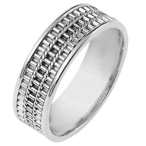 14 kt white gold, hand made comfort fit Wedding Band 6.5 mm wide. Three hand made patterns in the center. The whole ring is polished. Different finishes may be selected or specified.