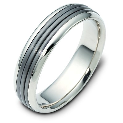 14 kt white gold and titanium , comfort fit, 6.0 mm wide wedding band. The titanium portion is matte finish and the rest is polished. Different finishes may be selected or specified.