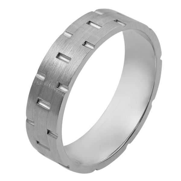 14 kt white gold, hand made comfort fit Wedding Band 5.0 mm wide. There are carved notches around the whole ring. The ring is a matte finish. Different finishes may be selected or specified.