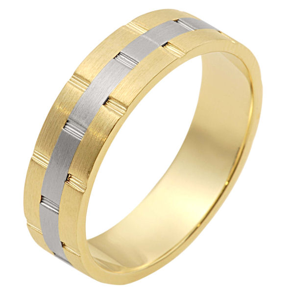 18 kt two-tone hand made comfort fit Wedding Band 6.0 mm wide. There are carved notches around the whole ring. The ring is a matte finish. Different finishes may be selected or specified.