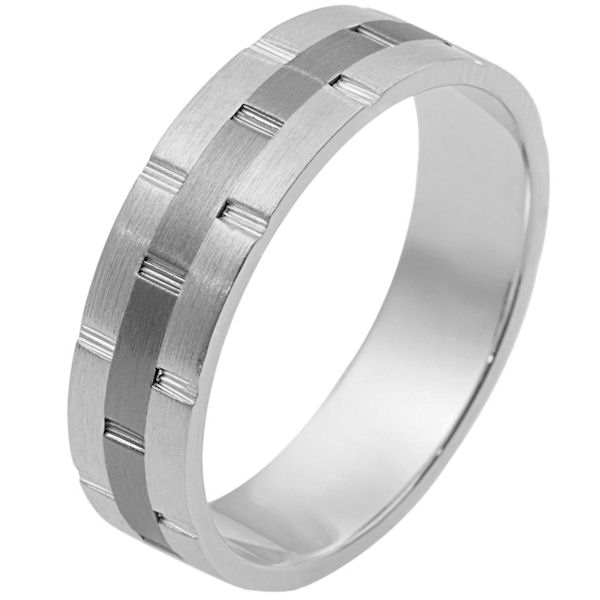 14K White gold and titanium, comfort fit, 6.0 mm wide wedding band. There are carved notches around the whole ring. The ring is a matte finish. Different finishes may be selected or specified.
