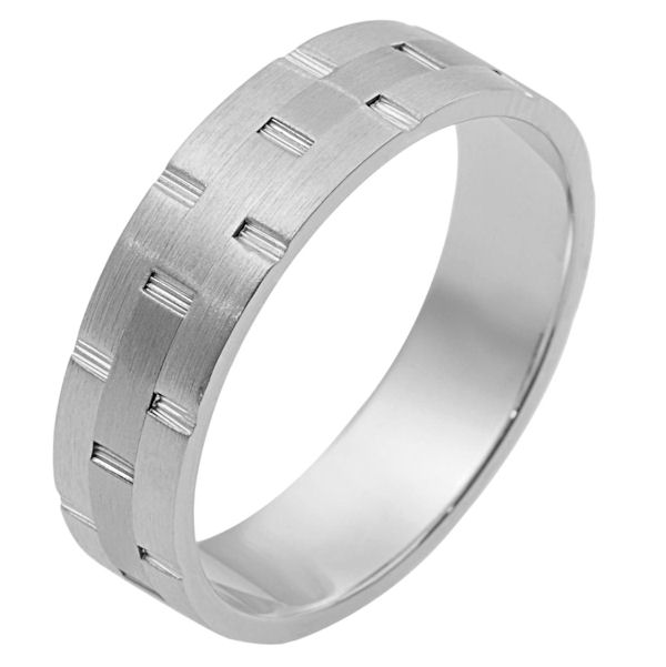 18 kt white gold, hand made comfort fit Wedding Band 6.0 mm wide. There are carved notches around the whole ring. The ring is a matte finish. Different finishes may be selected or specified.