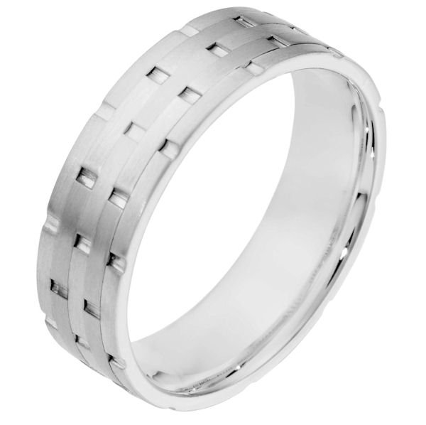 18 kt white gold, hand made comfort fit Wedding Band 6.5 mm wide. There are carved notches around the whole ring. The ring is a matte finish. Different finishes may be selected or specified.