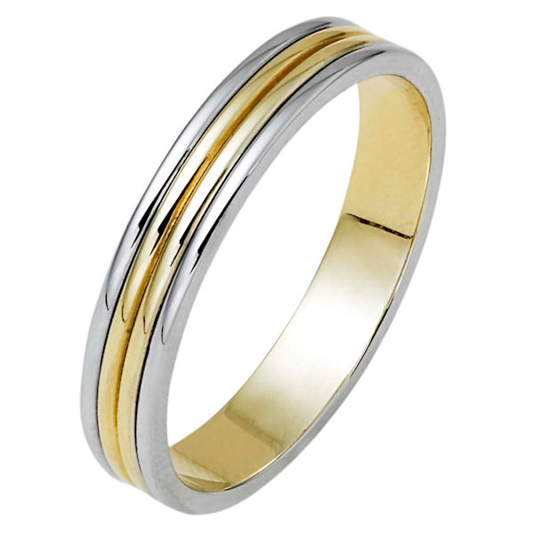 14 kt two-tone white and yellow gold, hand made comfort fit wedding band 4.0 mm wide. The whole ring is polished. Different finishes may be selected or specified.