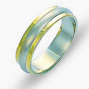 18 kt two-tone hand made comfort fit Wedding Band 5.0 mm wide. The center portion is matte finish and the edges are polished. Different finishes may be selected or specified.