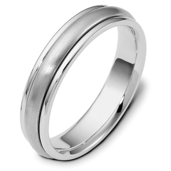 18K white gold, 5.0 mm wide, comfort fit wedding band. The center portion is matte finish and the edges are polished. Different finishes may be selected or specified.