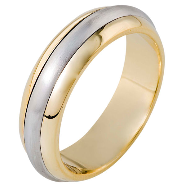 18 kt two-tone hand made comfort fit Wedding Band 6.0 mm wide. The center portion is matte finish and the edges are polished. Different finishes may be selected or specified.