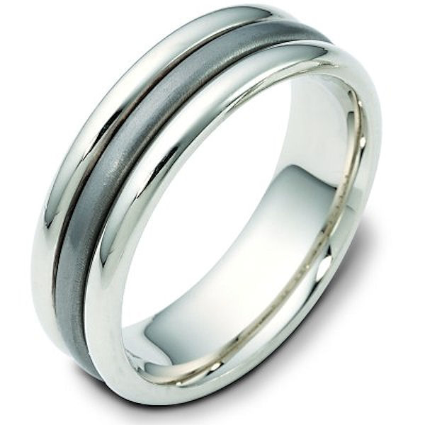14 kt white gold and titanium, comfort fit, 7.0 mm wide wedding band. The titanium portion is satin matte finish and the white gold is polished. Different finishes may be selected or specified.
