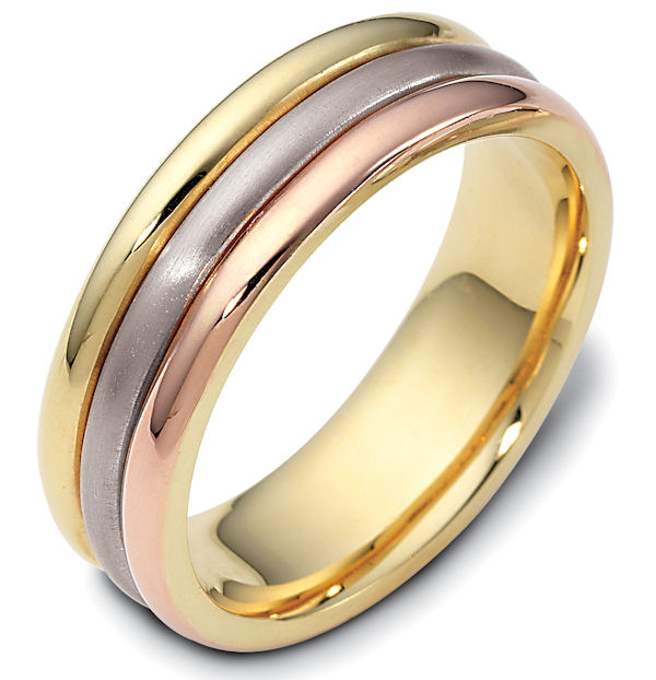 14 kt tri-color hand made comfort fit Wedding Band 6.5 mm wide. The center portion is a brush finish and the outer bands are polished. Different finishes may be selected or specified.