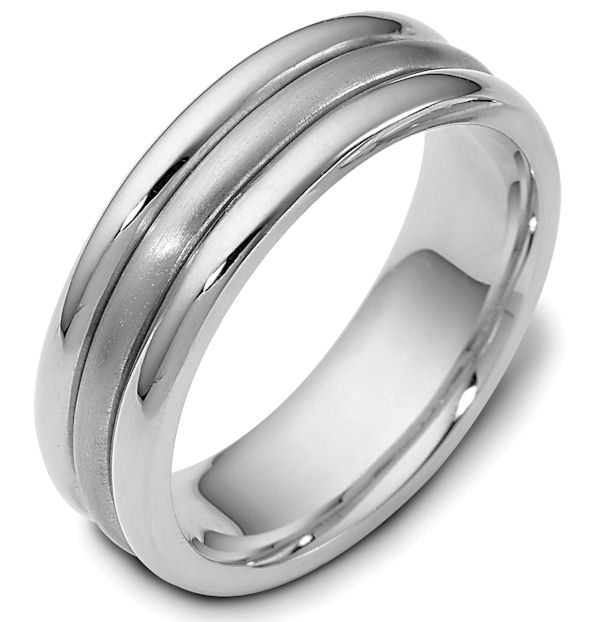 14 kt white gold hand made comfort fit Wedding Band 6.5 mm wide. The center portion is a brush finish and the outer bands are polished. Different finishes may be selected or specified.