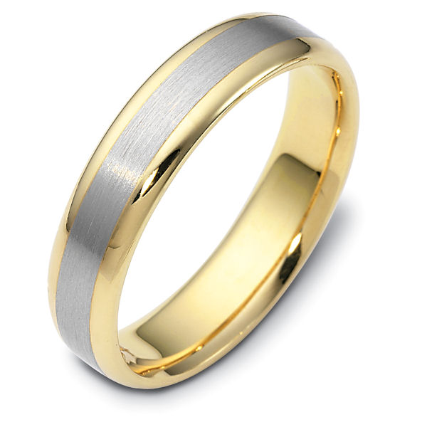 14 kt two-tone hand made comfort fit Wedding Band 5.0 mm wide. The center is a brush finish and the edges are polished. Different finishes may be selected or specified.