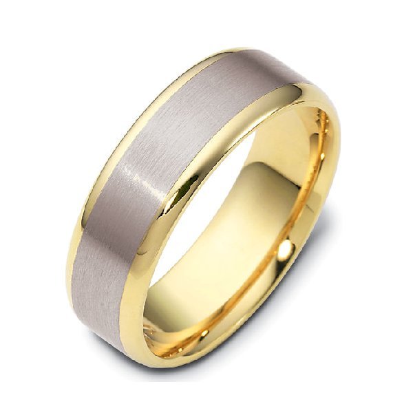 14 kt two-tone hand made comfort fit Wedding Band 6.0 mm wide. The center is a brush finish and the edges are polished. Different finishes may be selected or specified.