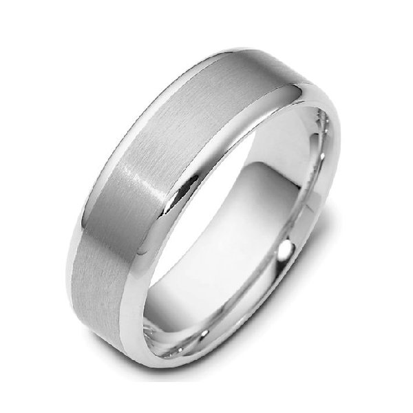 18 kt white gold, hand made comfort fit Wedding Band 6.0 mm wide. The center is a brush finish and the edges are polished. Different finishes may be selected or specified.