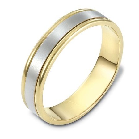 18 kt two-tone hand made comfort fit Wedding Band 5.0 mm wide. The center is a matte finish and the outer edges are polished. Different finishes may be selected or specified.